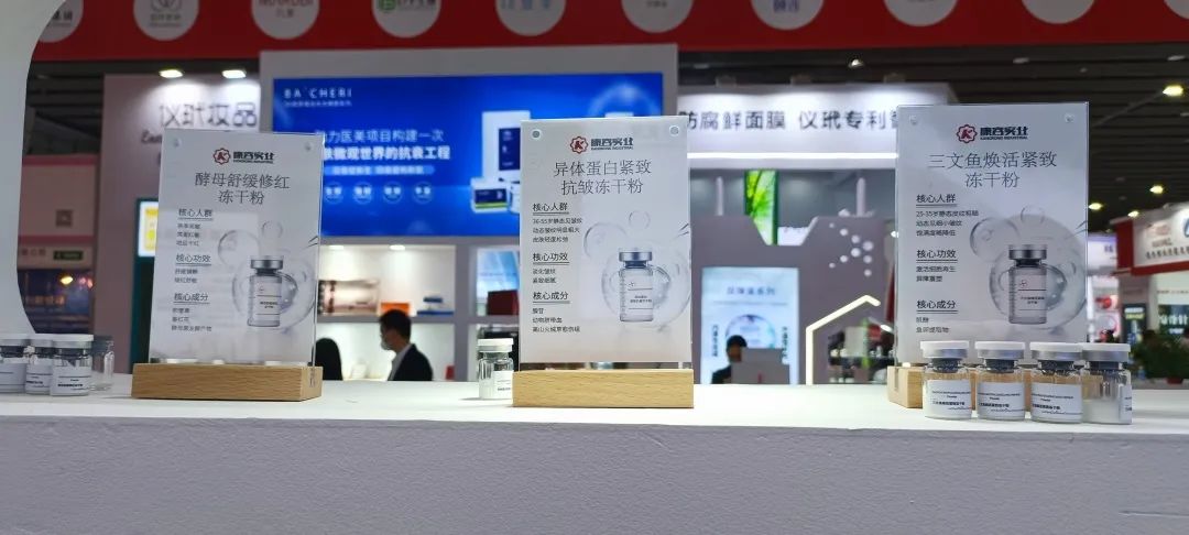 本次美博會,康容深挖凍干粉系列產品鏈條,打造高活性、溫和安全無防腐的凍干粉系列,生物科研冷凍鎖鮮科技將護膚品中易降解氧化的成分變成粉末狀態,最大程度地保留成分活性,讓有效成分深入滲透到基底,釋放鮮活護膚能量,避免防腐劑的使用,對敏感肌人群友好,以科技開啟功效護膚新體驗。