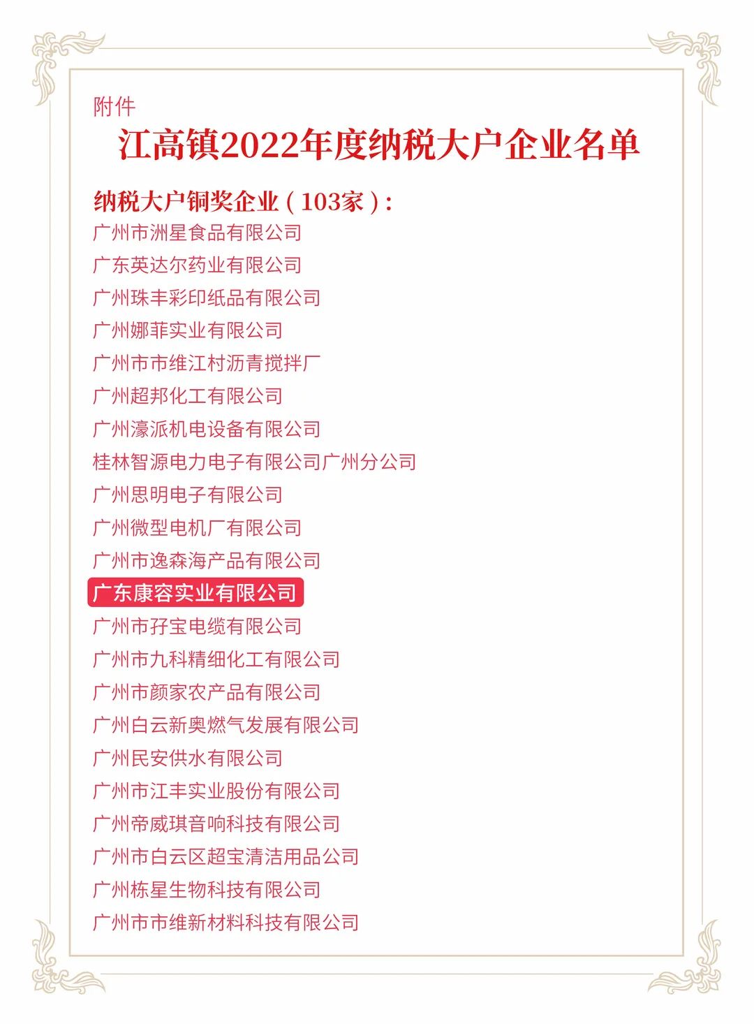 日前,廣州市白云區江高鎮人民政府發布關于表彰江高鎮2022年度納稅大戶的通報。廣東康容實業有限公司榮獲“江高鎮2022年度納稅大戶銅獎”榮譽稱號。