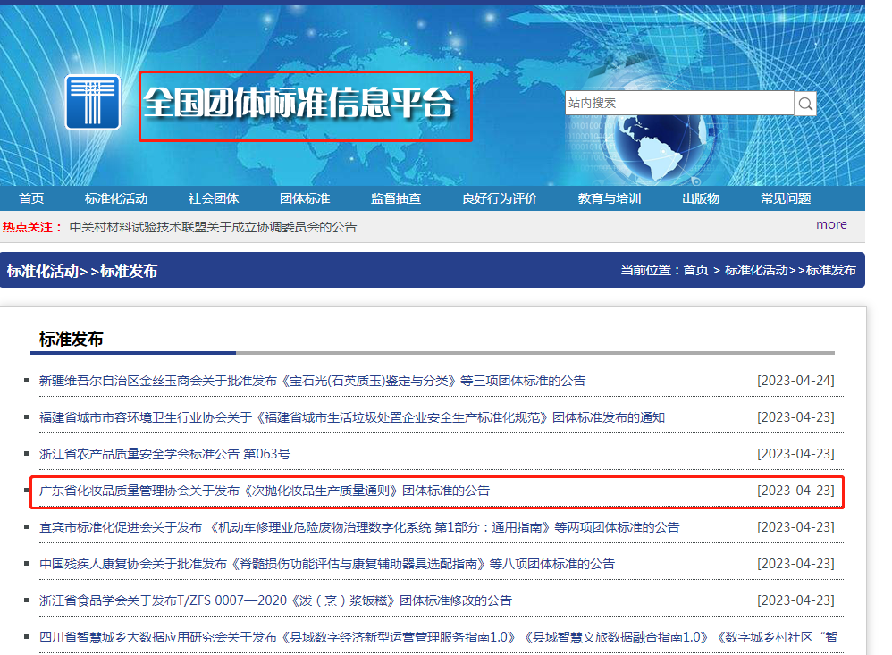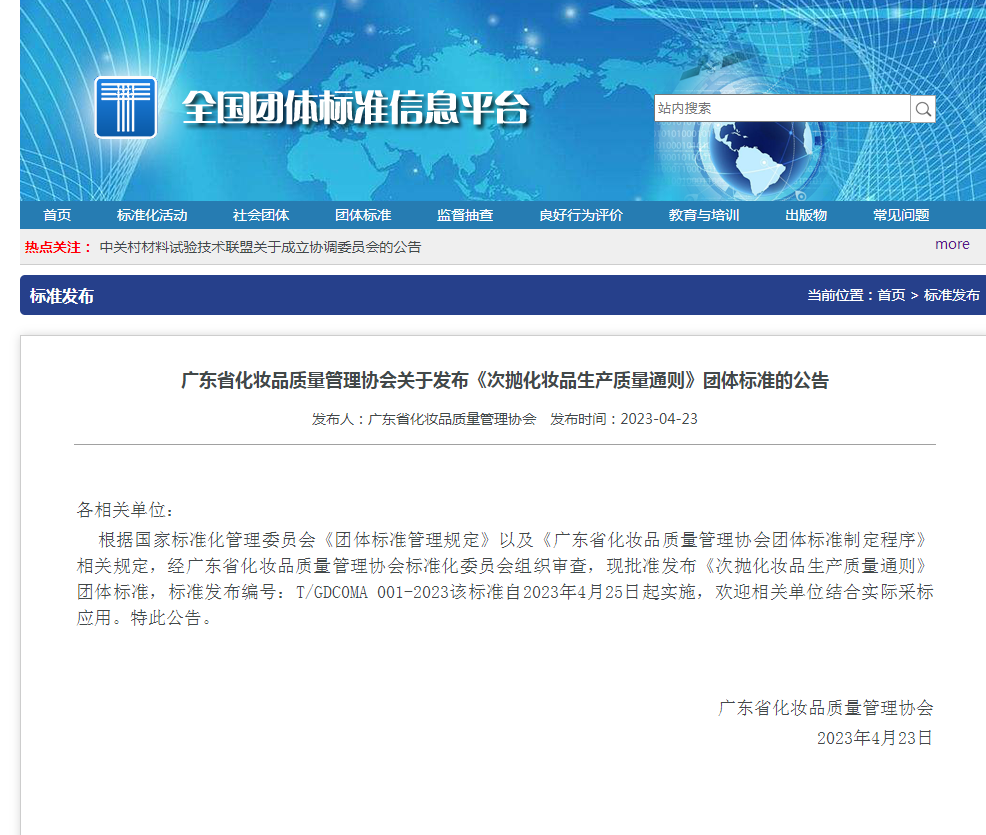 日前,由廣東康容實業有限公司、廣州市標準化研究院、廣東省化妝品質量管理協會、楚天科技股份有限公司等多家單位起草的《次拋化妝品生產質量通則》(標準編號:T/GDCOMA 001-2023)團體標準在全國團體標準信息平臺發布。