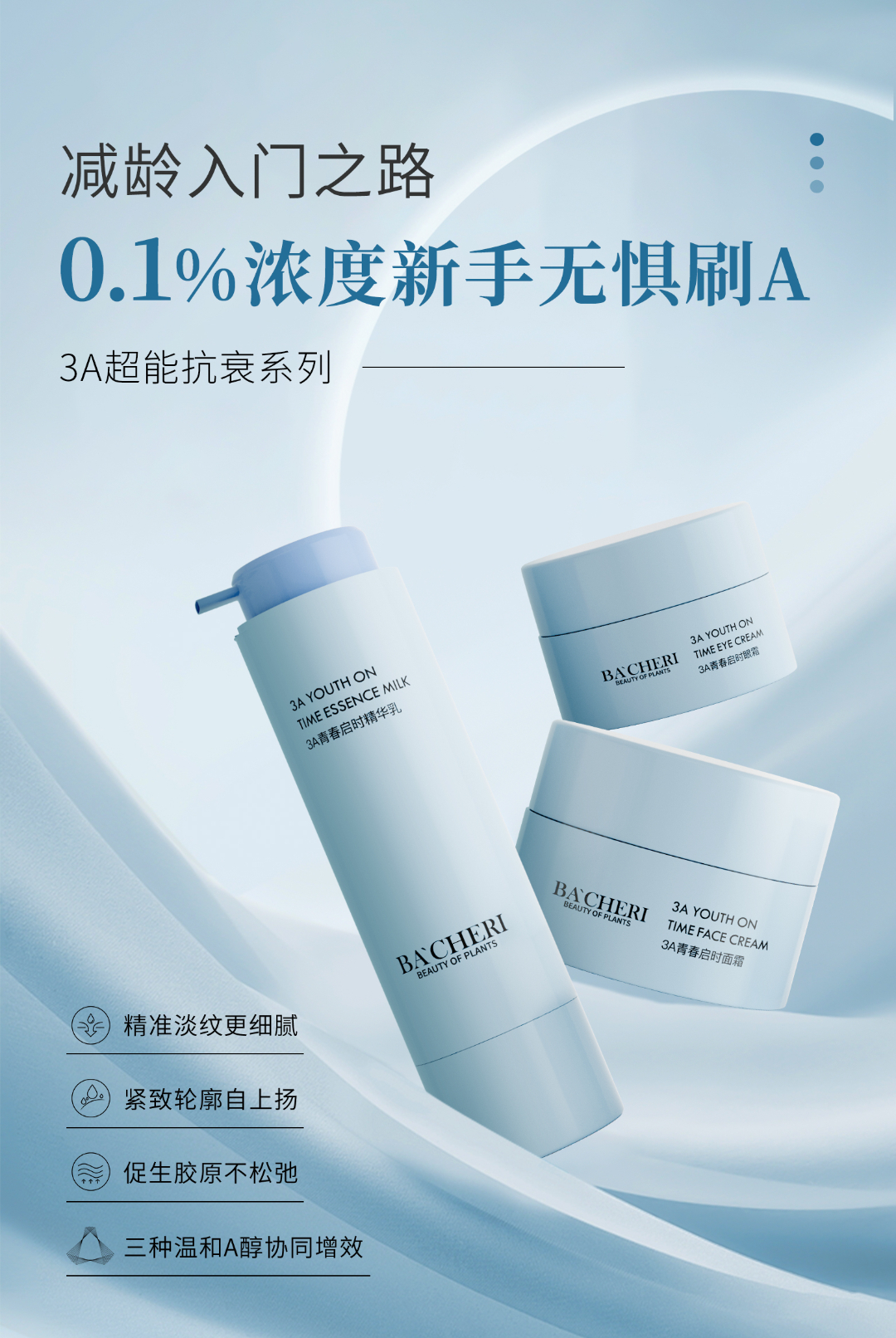 ②3A超能抗衰系列:三種溫和A醇協(xié)同增效,0.1%濃度也能實(shí)現(xiàn)溫和減齡。