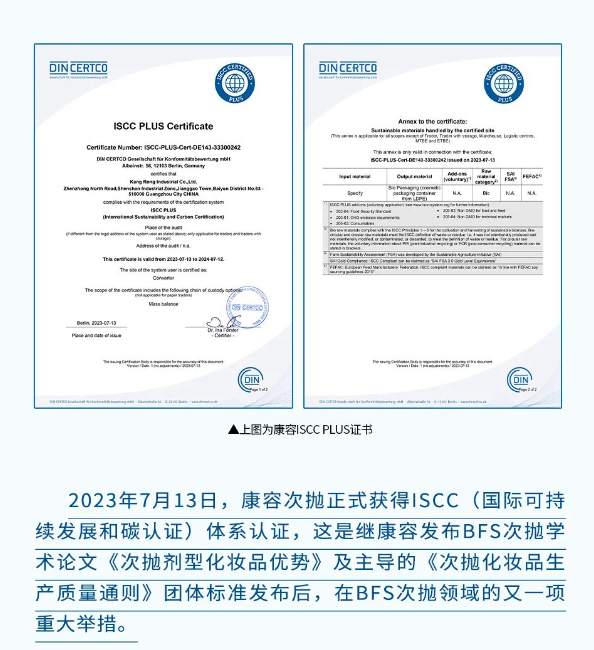 作為業內第一家聯合跨國公司完成次拋ISCC PLUS認證的企業,康容不忘初心,時刻牢記自己的社會責任,始終堅持「可持續發展」的戰略,以實際行動為行業探索并踐行科學減碳、綠色發展提供可行性參考,為社會提供了可持續發展的方案。