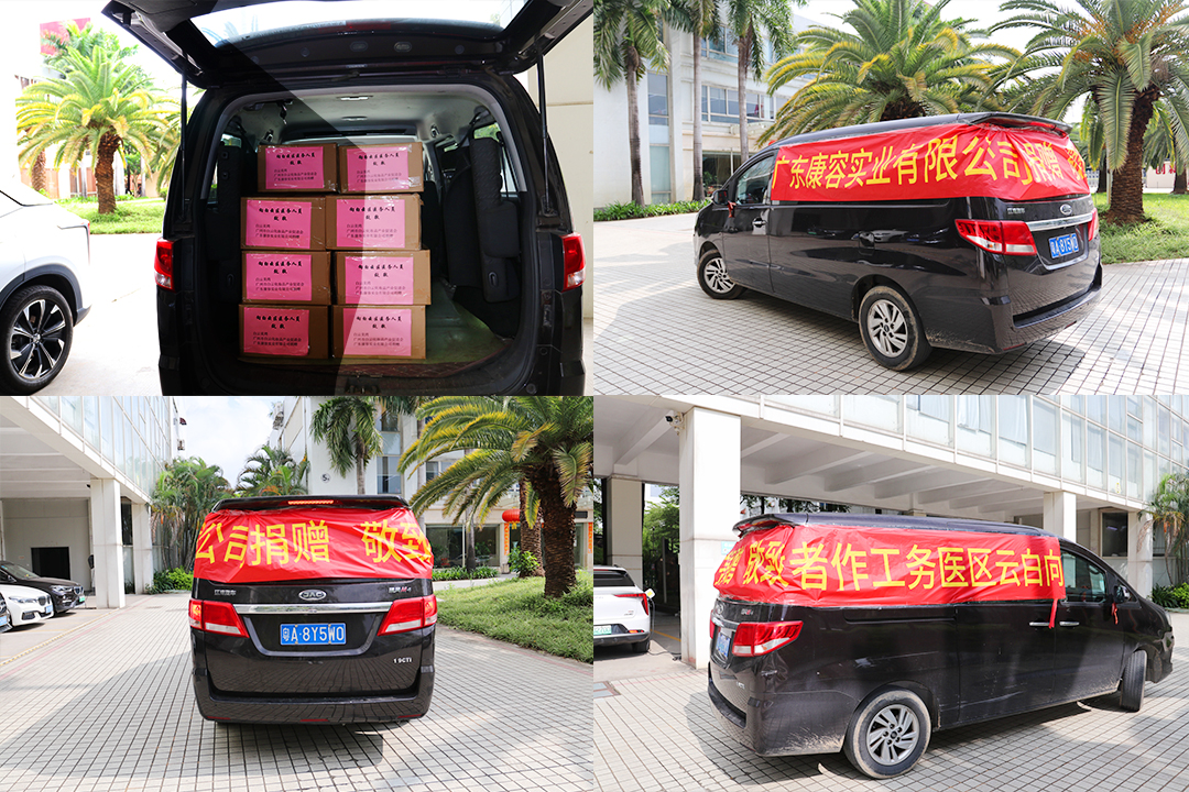 6月10日上午9點10分,一輛腰掛“向白云區醫務工作致敬,廣東康容實業捐贈”紅色橫幅的商務車,滿載著抗疫防護物品,駛出了康容實業高新園區大門