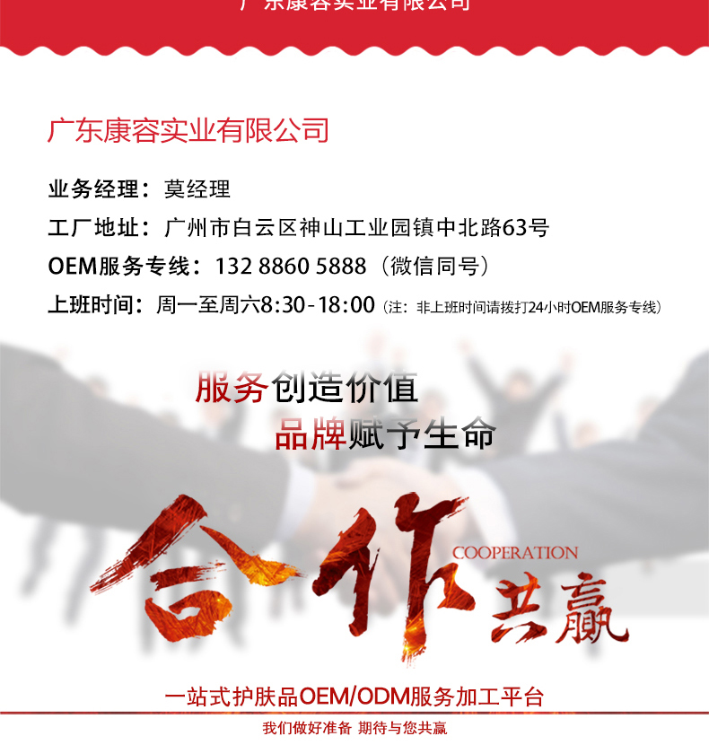 咨詢熱線:13802777831 工廠地址:廣州市白云區江高鎮神山工業園振中北路 63 號 主營業務: 化妝品 oem / 化妝品加工 / 護膚品代加工 / 面膜加工 / 次拋原液代加工 / 凍干粉加工 / 嬰童系列加工 / 套盒系列加工等