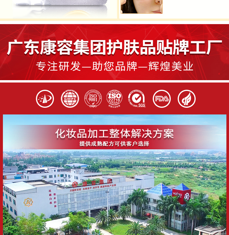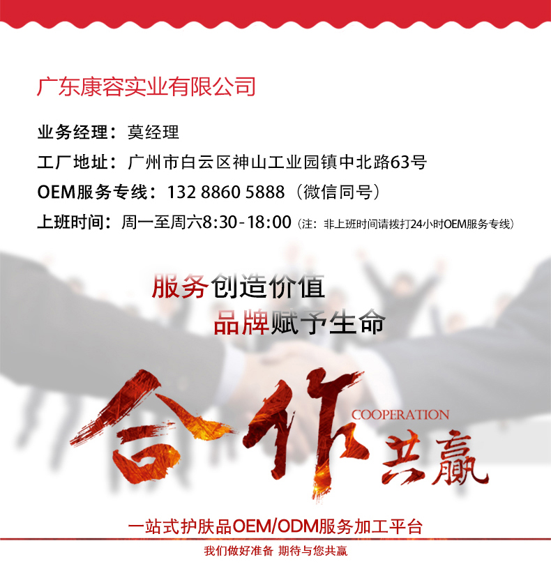 咨詢熱線:13802777831 工廠地址:廣州市白云區江高鎮神山工業園振中北路 63 號 主營業務: 化妝品 oem / 化妝品加工 / 護膚品代加工 / 面膜加工 / 次拋原液代加工 / 凍干粉加工 / 嬰童系列加工 / 套盒系列加工等