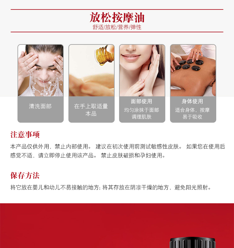 ③均勻涂抹于面部調理肌膚或涂抹身體,按摩易于吸收