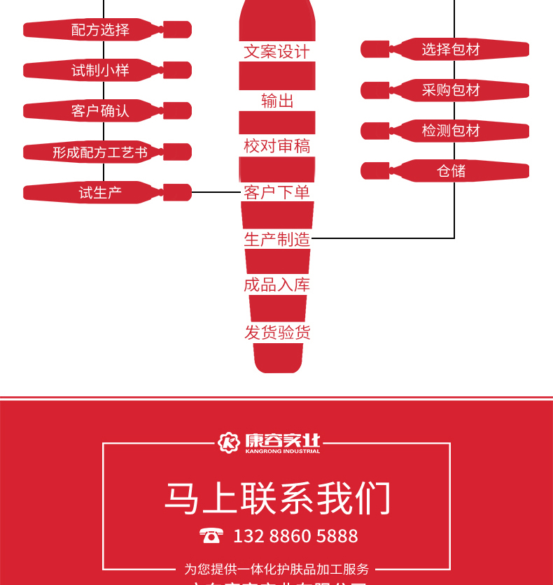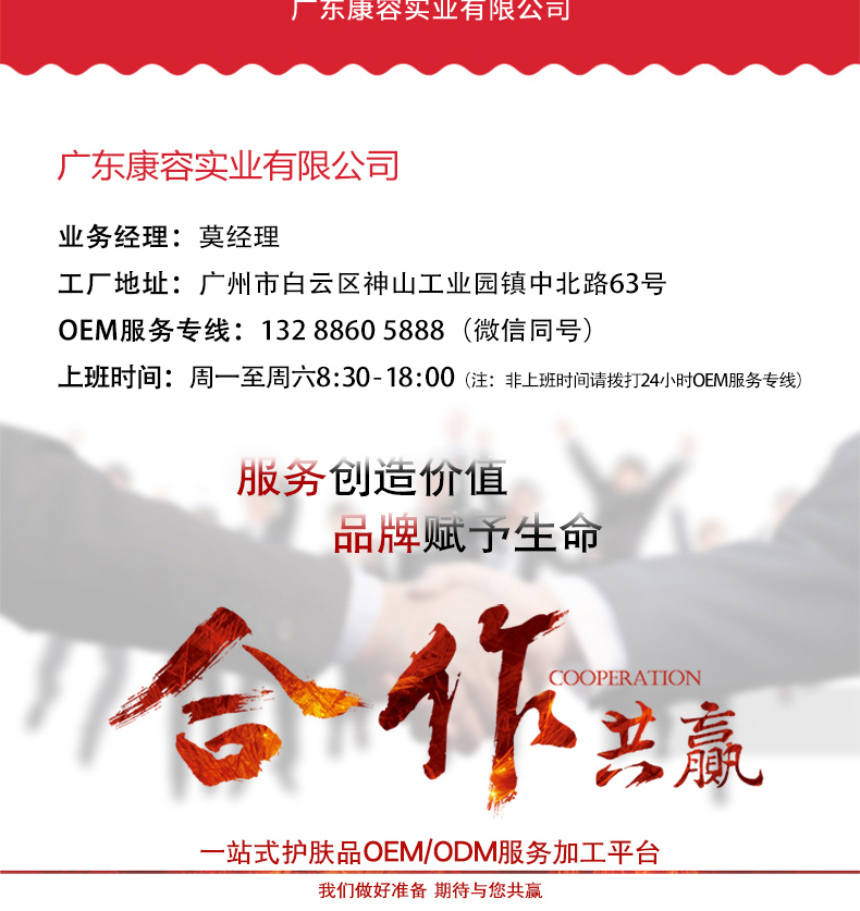 咨詢熱線:13802777831 工廠地址:廣州市白云區江高鎮神山工業園振中北路 63 號 主營業務: 化妝品 oem / 化妝品加工 / 護膚品代加工 / 面膜加工 / 次拋原液代加工 / 凍干粉加工 / 嬰童系列加工 / 套盒系列加工等