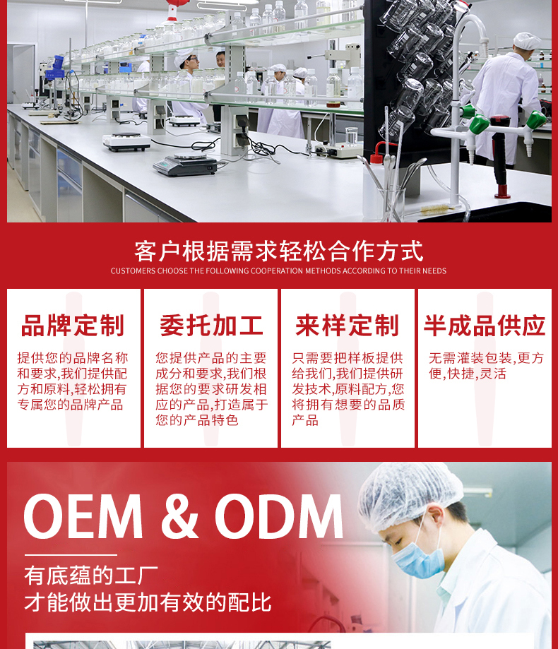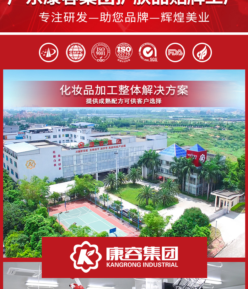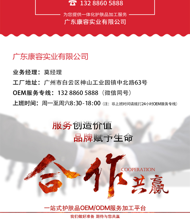 咨詢熱線:13802777831 工廠地址:廣州市白云區江高鎮神山工業園振中北路 63 號 主營業務: 化妝品 oem / 化妝品加工 / 護膚品代加工 / 面膜加工 / 次拋原液代加工 / 凍干粉加工 / 嬰童系列加工 / 套盒系列加工等