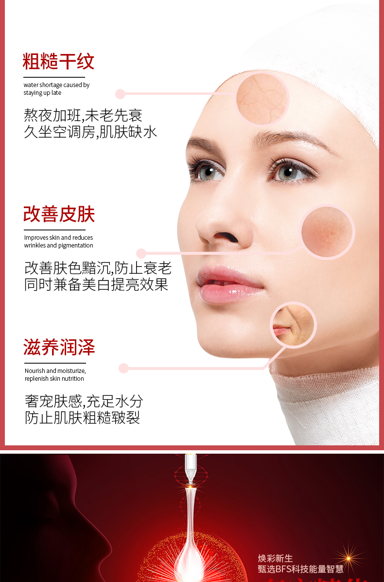 ④解決8大肌膚困境:有皺紋·眼角細紋·無光澤·無彈性·有色斑·干燥粗糙·無營養(yǎng)·無水分