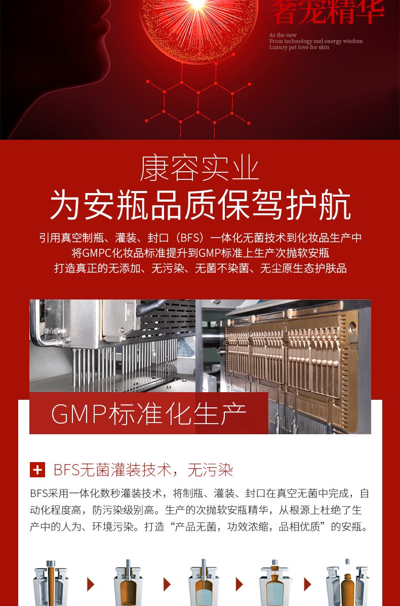 精華微細(小分子)滲透,源源浸潤(層層疊加)修護肌膚,平滑干紋細紋,改善肌膚,使肌膚柔潤、細膩、緊致、透亮