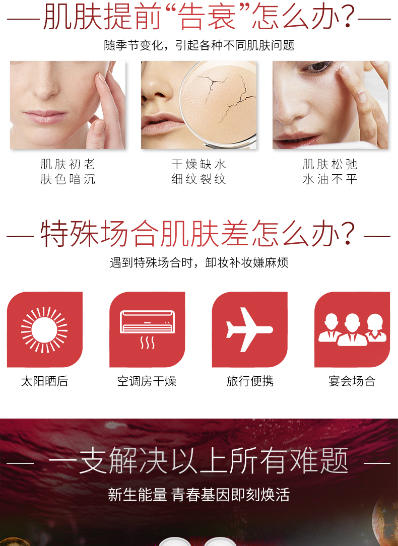 ①內(nèi)含多種精粹活性,直達(dá)肌底深層,為肌膚注入年輕能量、喚醒肌膚,改善面部松弛現(xiàn)象令肌膚由底部向上緊致,重塑肌膚年輕輪廓、愈發(fā)透亮緊實(shí),豐盈飽滿。