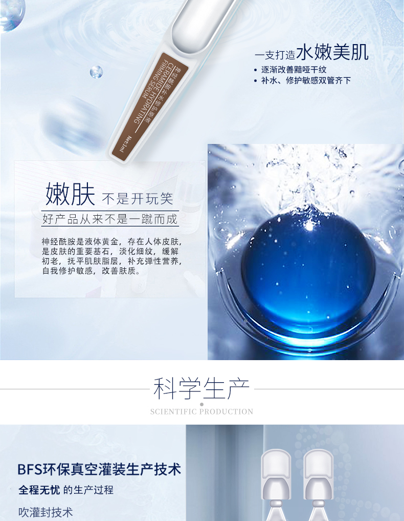 ③補水精靈透明質酸鈉能夠使得皮膚水潤彈嫩,滋潤煥活,深層補水鎖水,改善黯啞干紋