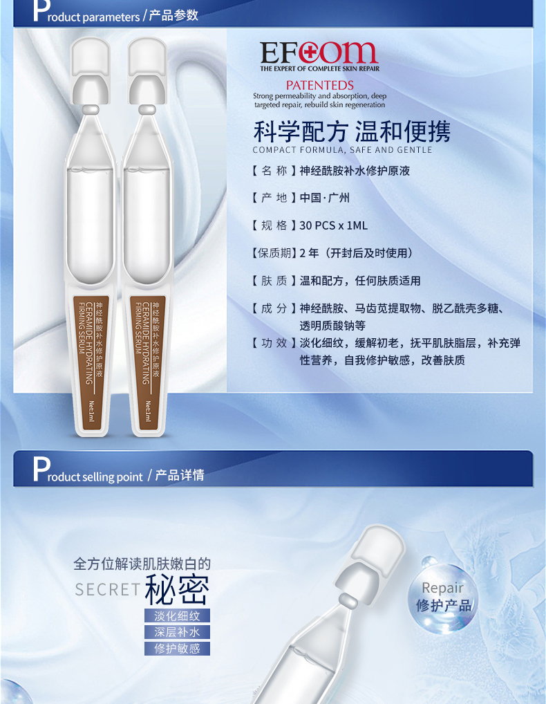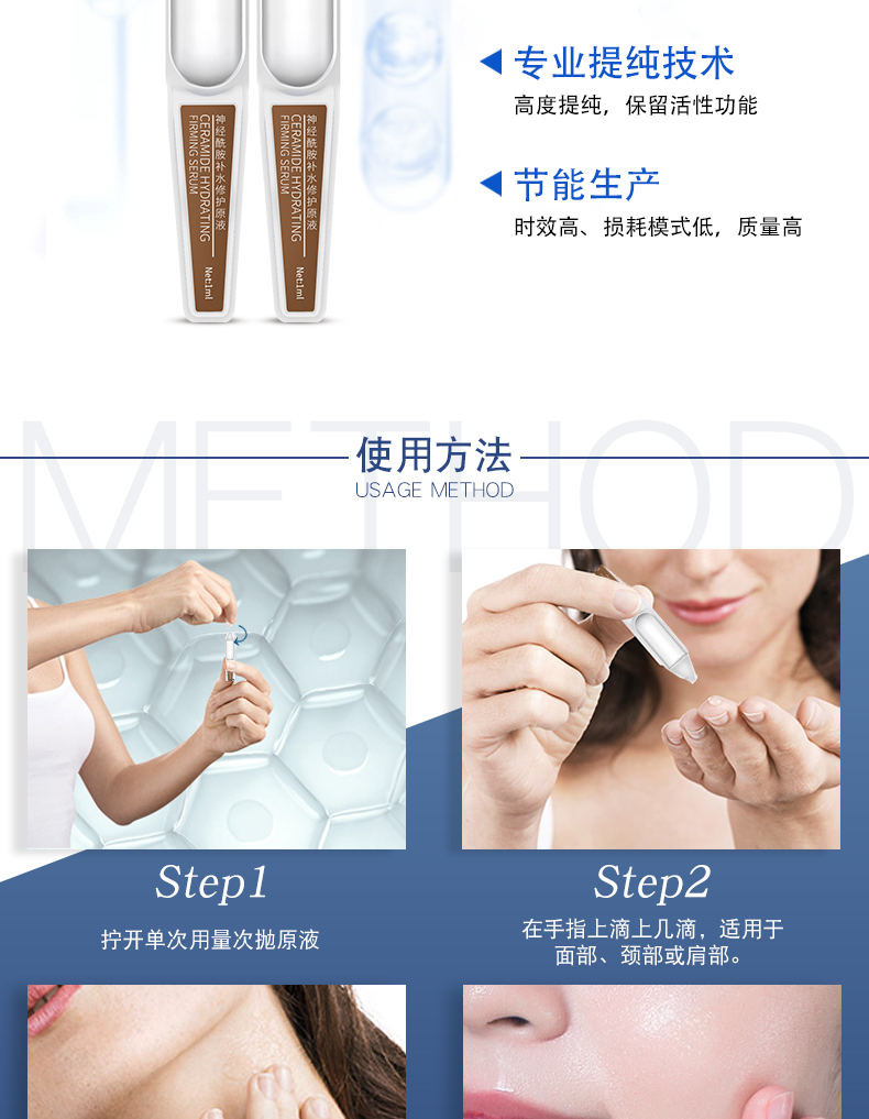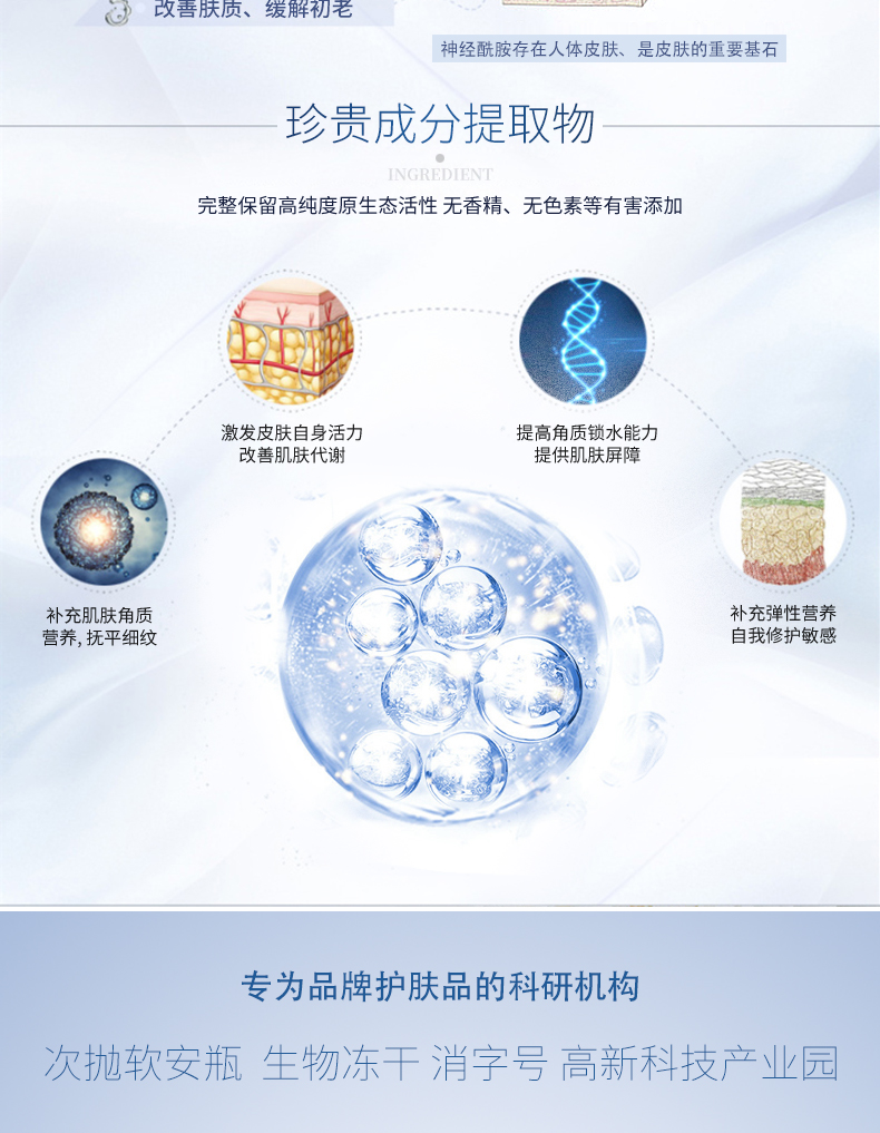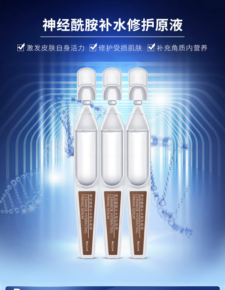 ②神經(jīng)酰胺是液體黃金,天然存在人體皮膚,是皮膚的重要基石,淡化細(xì)紋,緩解初老,撫平肌膚脂層,補(bǔ)充彈性營(yíng)養(yǎng),自我修護(hù)敏感,改善膚質(zhì)。