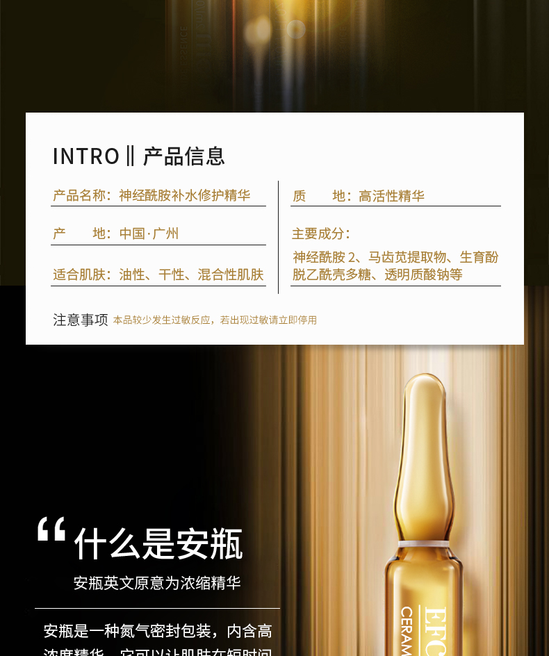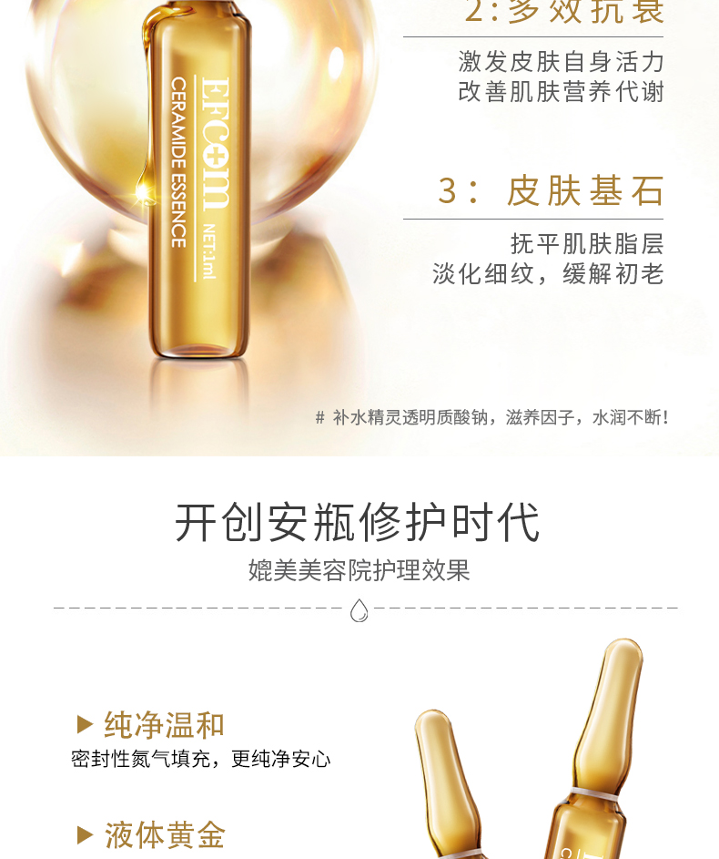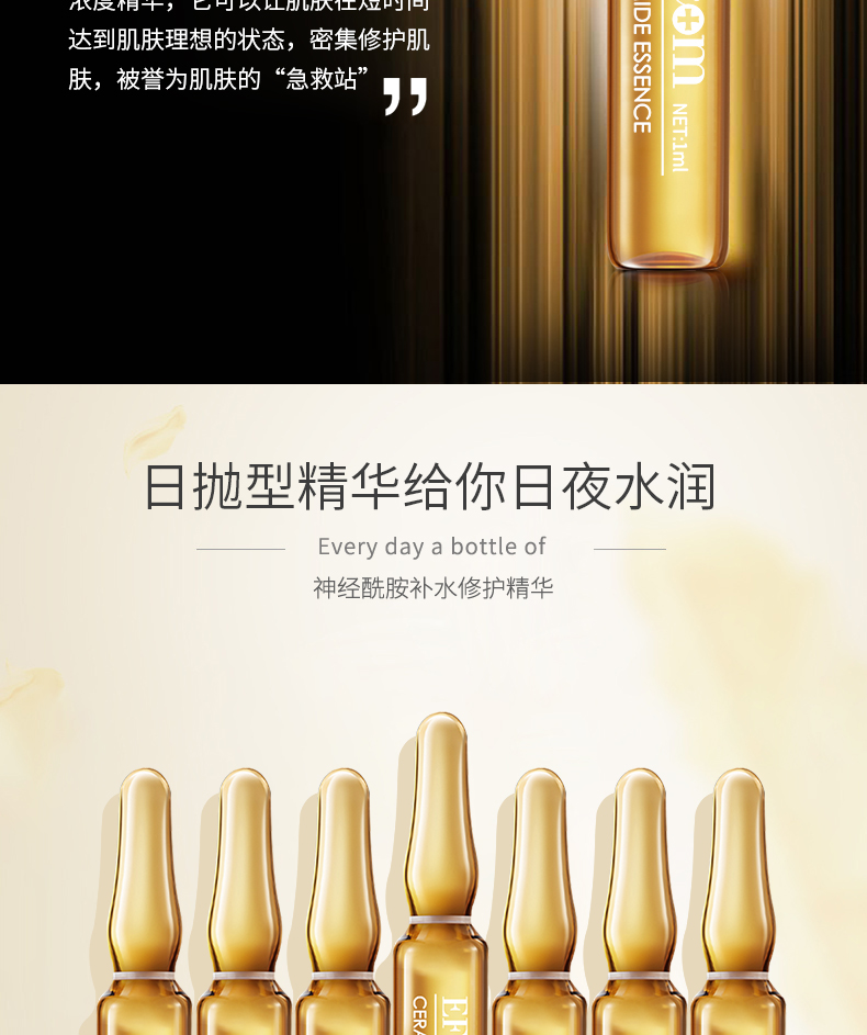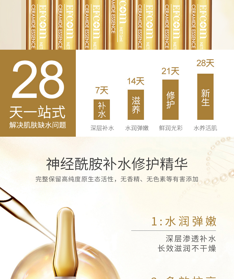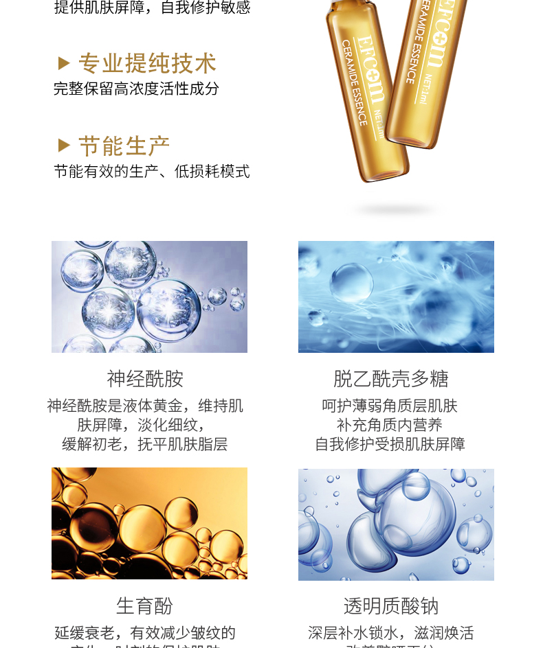 ①神經(jīng)酰胺是液體黃金,天然存在人體皮膚,是皮膚的重要基石,淡化細(xì)紋,緩解初老,撫平肌膚脂層,補(bǔ)充彈性營養(yǎng),自我修護(hù)敏感,改善膚質(zhì)。