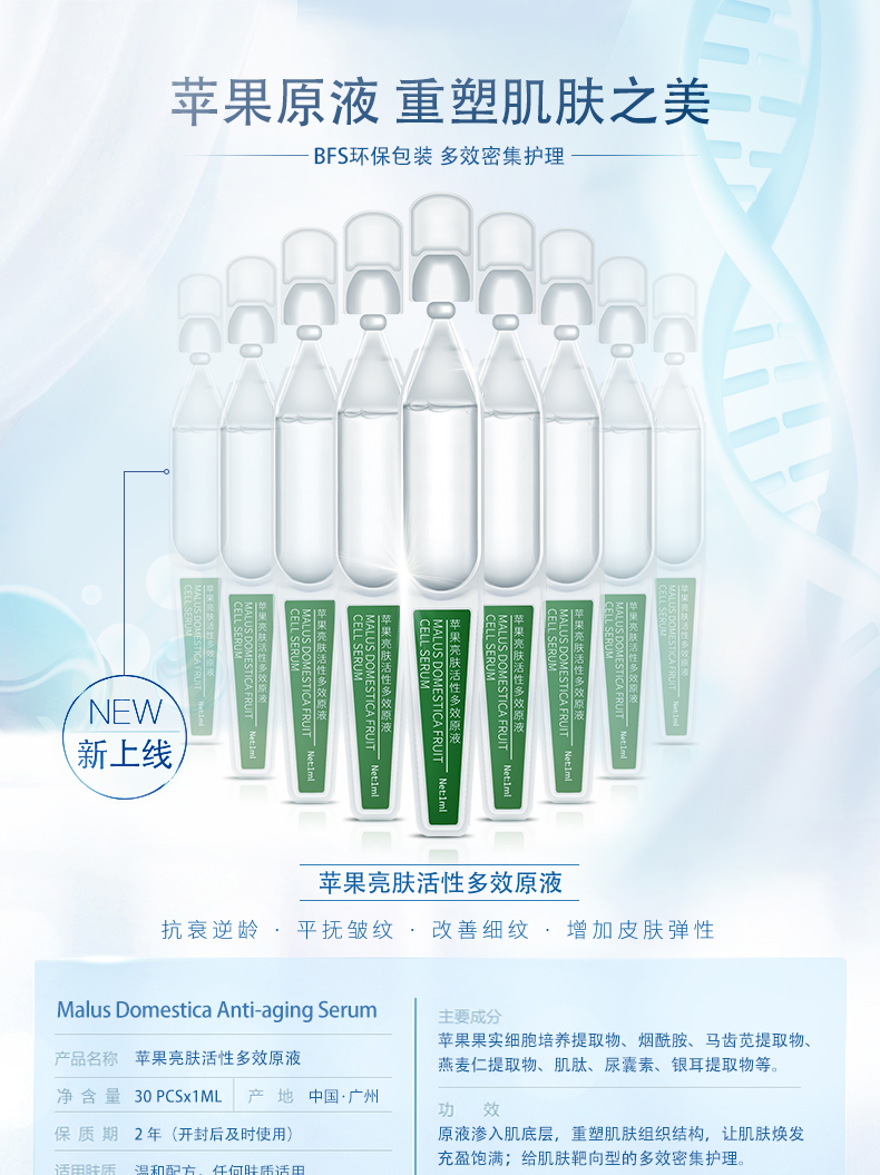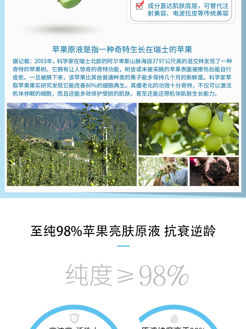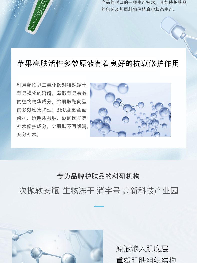 ②利用超臨界二氧化碳對特殊瑞士蘋果植物的溶解,萃取蘋果有效的提取植物精華,成分,給肌膚靶向型的強效密集護理。