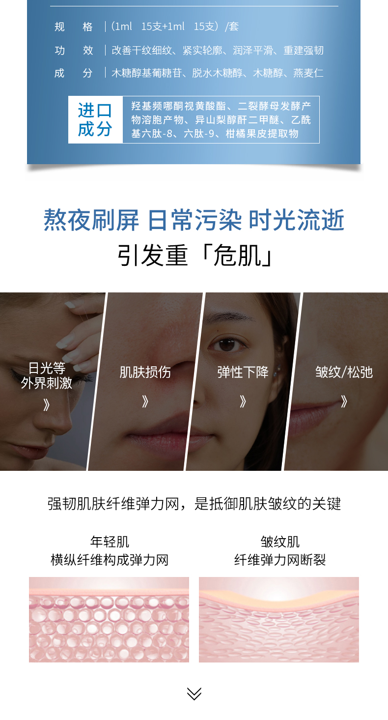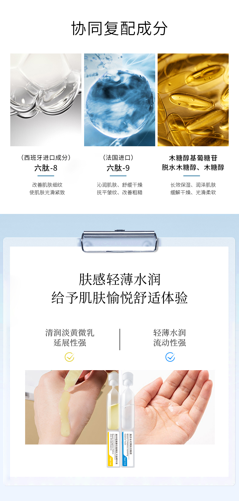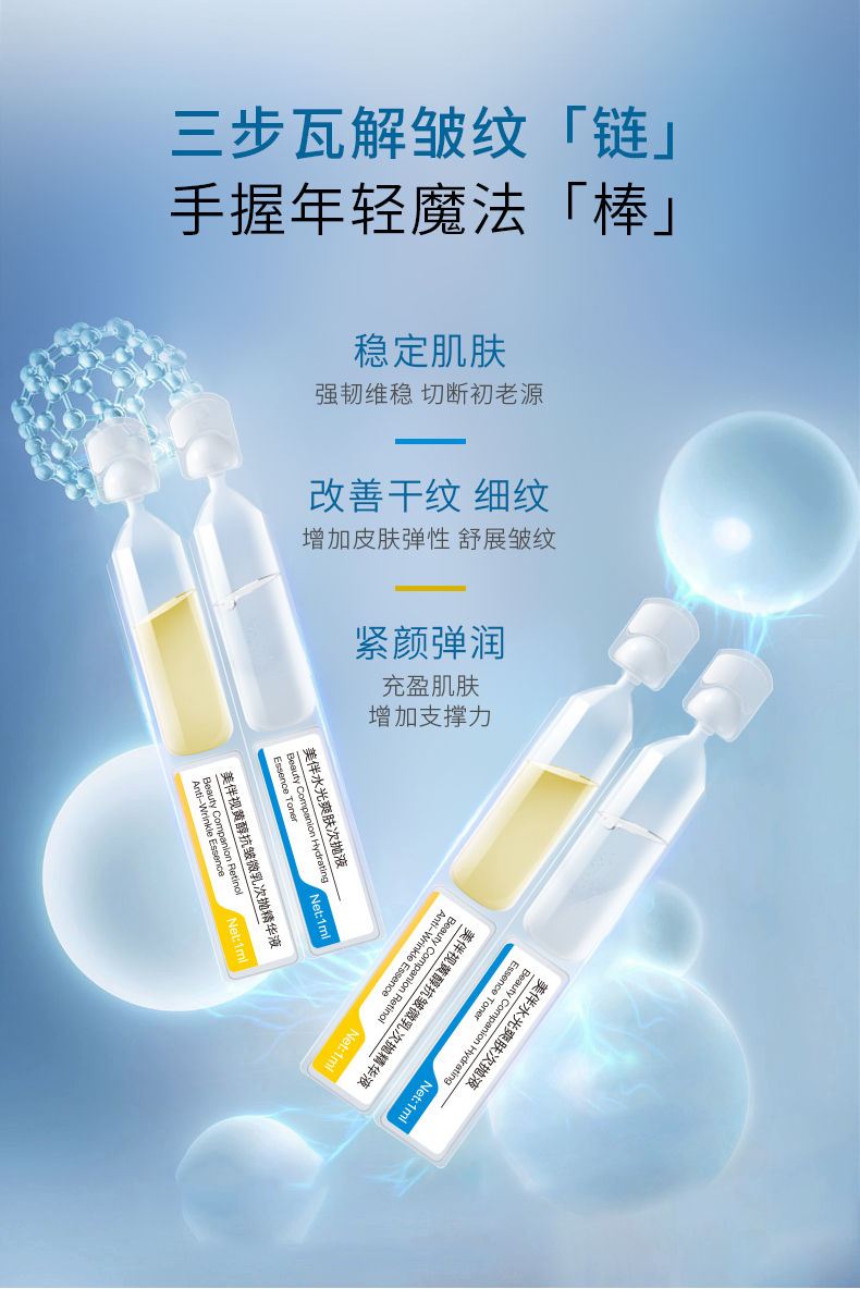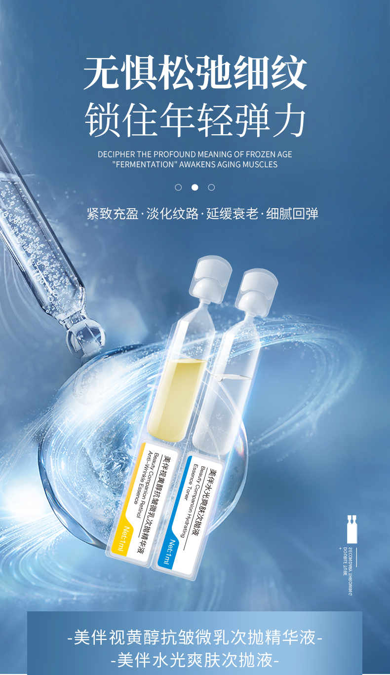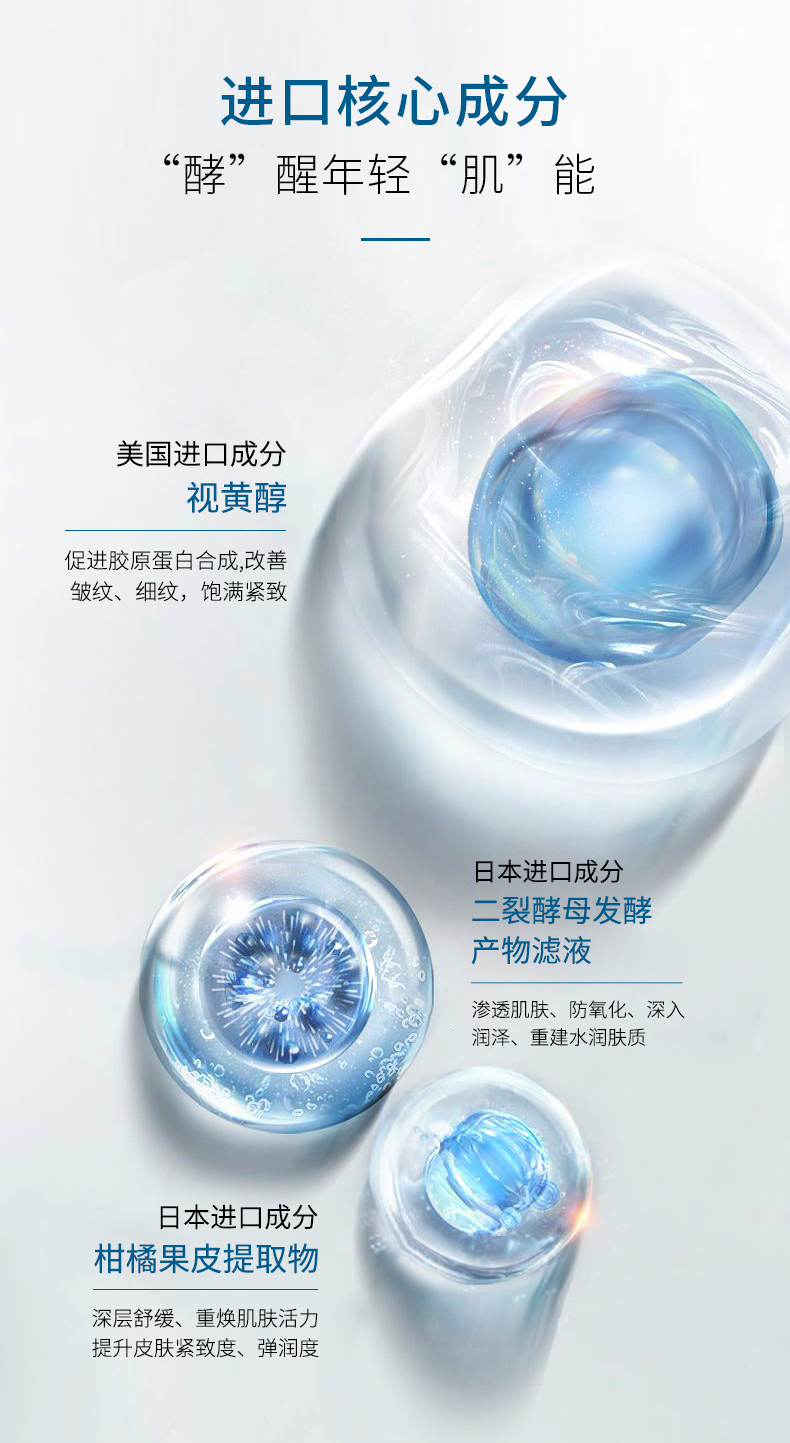 1.滴滴精粹 極度潤養 視黃醇和二裂酵母均為市面上大熱成分,已經有了一定的市場前期準備,并且成分著重點在于功效濃度以及對于皮膚的承受度,產品具有功效強、無酒精無香精無防腐劑。 2.雙管雙料 靶向抗衰 二裂酵母精粹搭配視黃酸酯(HPR)和多種保濕成分,多種營養成分深入潤澤平滑肌膚,重建水潤強韌的角質層,使肌膚更加水嫩、飽滿、亮澤。 3.清爽溫潤 一抹即融 精華液質地輕薄易吸收;兩者高效的修護肌膚煥亮膚色同時打造輕薄清爽的護膚體驗感。