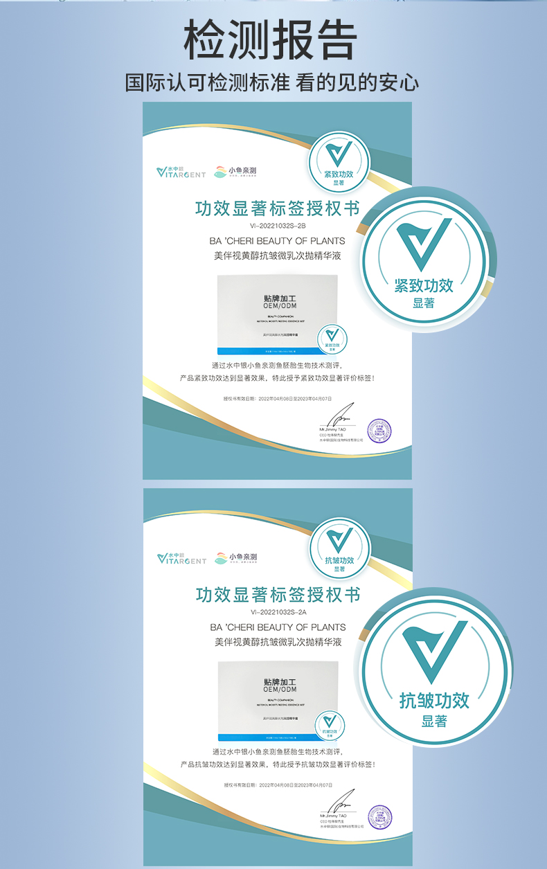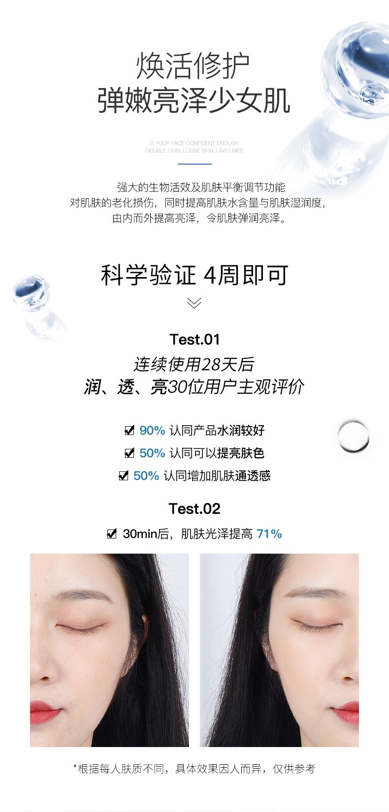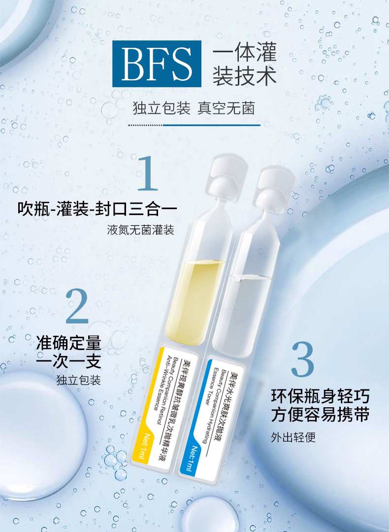 成分: 環聚二甲基硅氧烷;水解胎盤(羊)提取物;辛酸/葵酸甘油三酯;生育酚乙酸酯;玫瑰(ROSA RUGOSA)花油。 說明: 產品規格有0.5mlX30支 次拋生產應用的B.F.S無菌檢測灌裝技術,最先應用于醫藥行業,最常見的是醫用軟安瓶以及眼部滴劑。 B.F.S技術將“吹、灌、封”三合一,1秒密封,防污染級別高,可以最大限度地避免操作人員對無菌生產的干擾,有效避免微生物及金屬離子對原液的污染;真空包裝無需添加防腐劑,一支一次的用量,一次一支,避免二次污染,完全可以保證產品沒有任何防腐劑添加,并且真正地做到了終端滅菌。