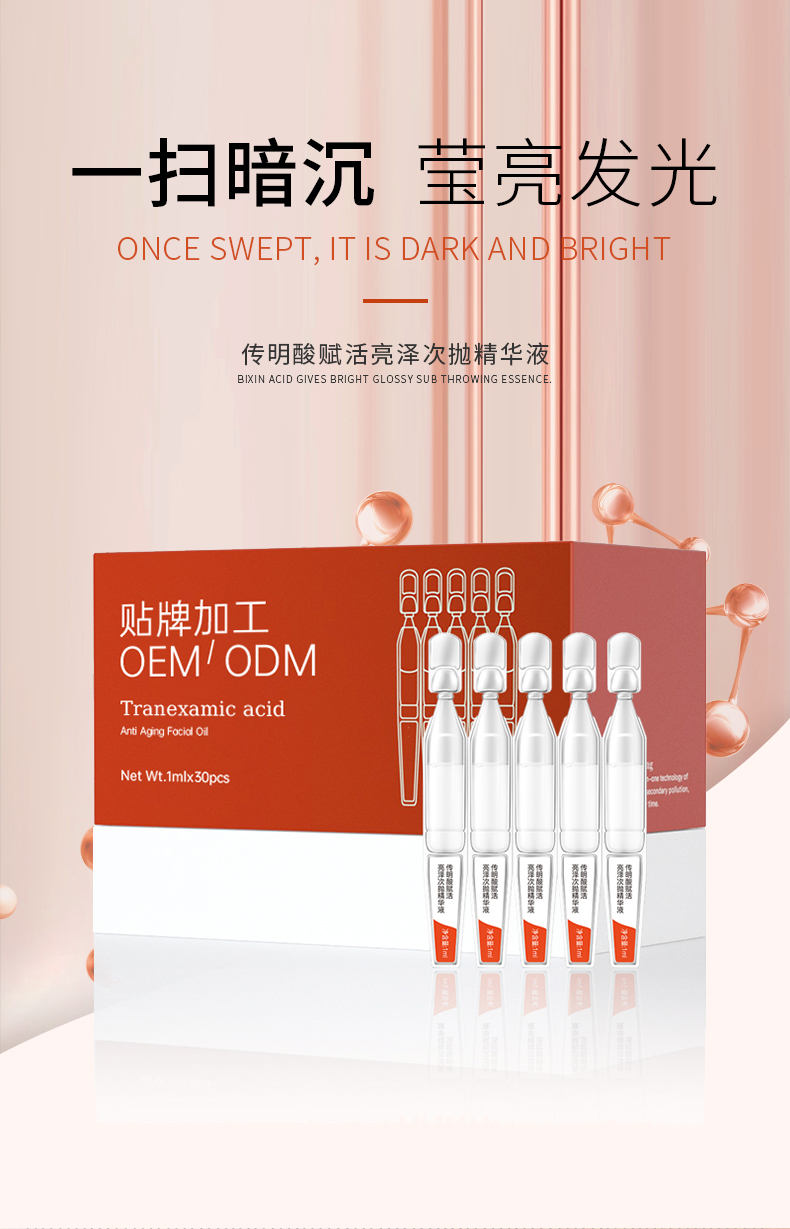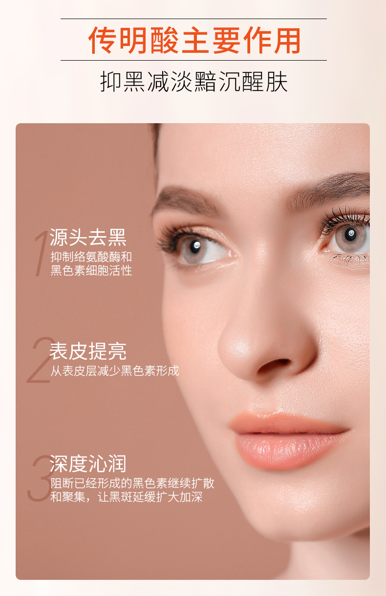紫外線會激發酪氨酸酶,使黑色素蛋白數量增加,膚色持續加深。傳明酸能防止曬后肌膚色素沉淀,無刺激、光敏感度低。