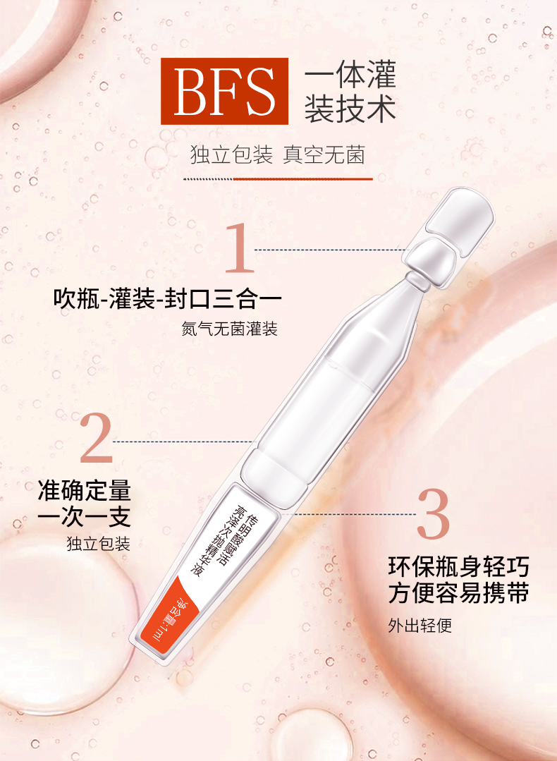 B.F.S技術將“吹、灌、封”三合一,1秒密封,防污染級別高,可以最大限度地避免操作人員對無菌生產的干擾,有效避免微生物及金屬離子對原液的污染;真空包裝無需添加防腐劑,一支一次的用量,一次一支,避免二次污染,完全可以保證產品沒有任何防腐劑添加,并且真正地做到了終端滅菌。