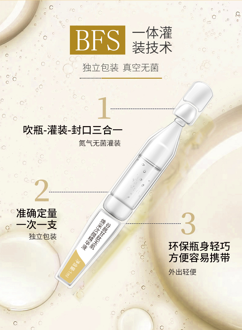 B.F.S技術將“吹、灌、封”三合一,1秒密封,防污染級別高,可以最大限度地避免操作人員對無菌生產的干擾,有效避免微生物及金屬離子對原液的污染;真空包裝無需添加防腐劑,一支一次的用量,一次一支,避免二次污染,完全可以保證產品沒有任何防腐劑添加,并且真正地做到了終端滅菌。
