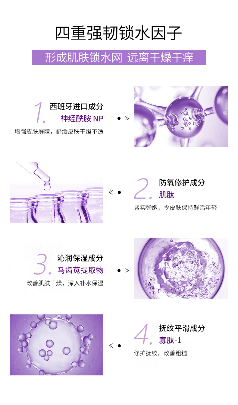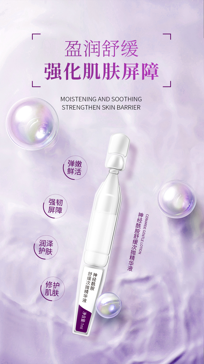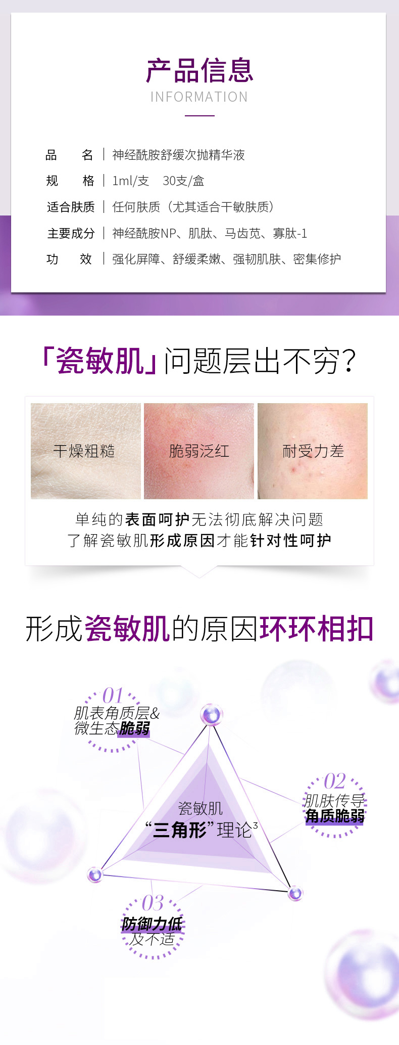 產(chǎn)品功效特點: 1.建立舒緩保濕矩陣 馬齒筧預(yù)防肌膚干燥老化,增加皮膚舒適度+透明質(zhì)酸硬核補水保濕 2、靶向狙擊敏感脆弱問題 肌肽抗氧化,抗自由基,抗炎 3.深筑肌膚防線 神經(jīng)酰胺NP修補脂質(zhì),肌膚基層健康 4.強韌肌膚屏障力 寡肽-1 修護(hù)受損肌膚