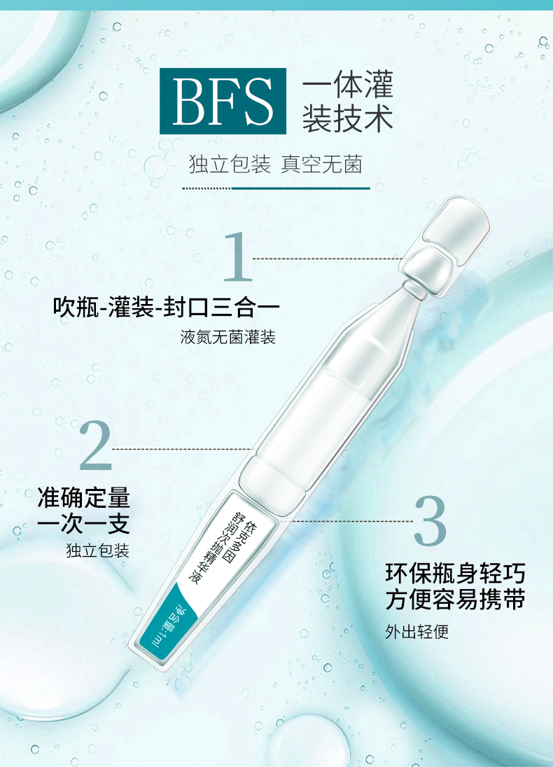 B.F.S技術將“吹、灌、封”三合一,1秒密封,防污染級別高,可以最大限度地避免操作人員對無菌生產的干擾,有效避免微生物及金屬離子對原液的污染;真空包裝無需添加防腐劑,一支一次的用量,一次一支,避免二次污染,完全可以保證產品沒有任何防腐劑添加,并且真正地做到了終端滅菌。